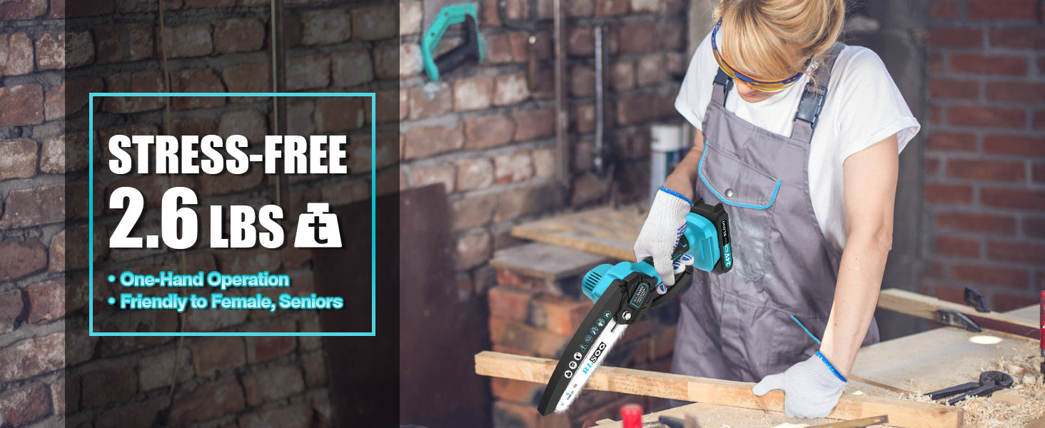 Weighing only 2.6 lbs (including the battery), this handheld mini chainsaw is lightweight and easy to operate with one hand. Its portable design makes it suitable for both indoor and outdoor use. Ideal for all users, including women and seniors, it simplifies gardening and yard tasks, making it a thoughtful gift for parents and grandparents.