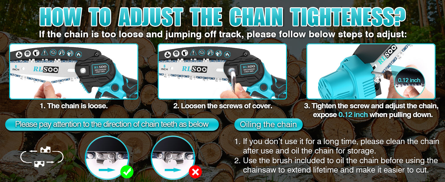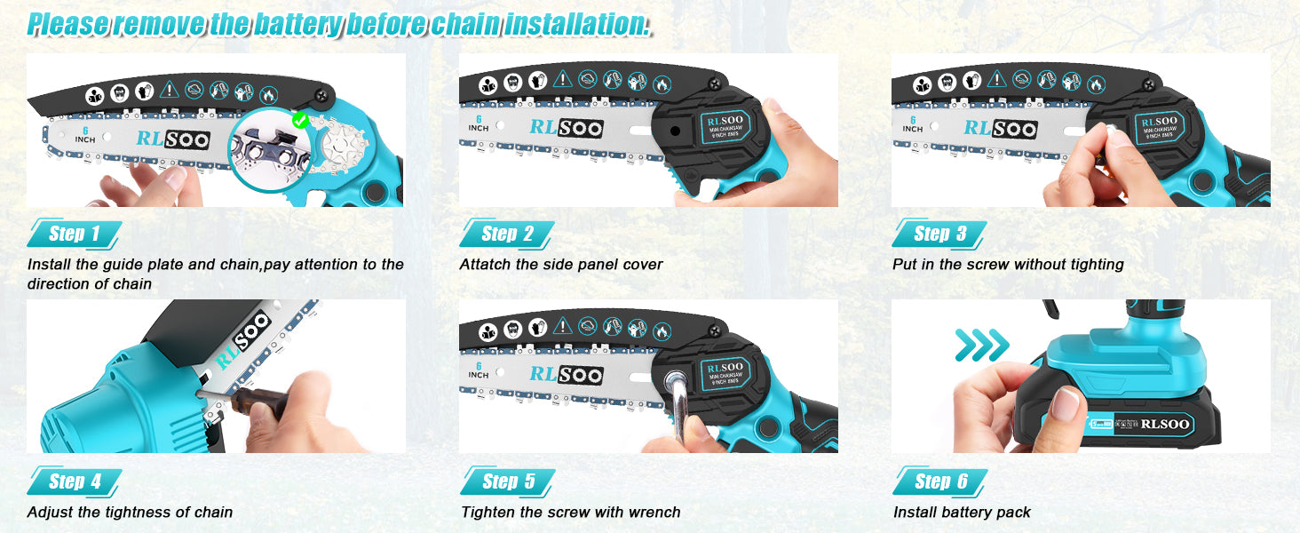 The RLSOO electric chainsaw comes pre-assembled and requires only a quick chain tension adjustment using the included screwdriver. Simply insert the fully charged battery and start cutting. Perfect for wood cutting, garden pruning, branch trimming, and bush clearing. Suitable for gardens, farms, parks, forests, orchards, greenhouses, hiking, and camping.