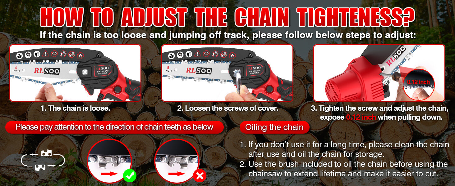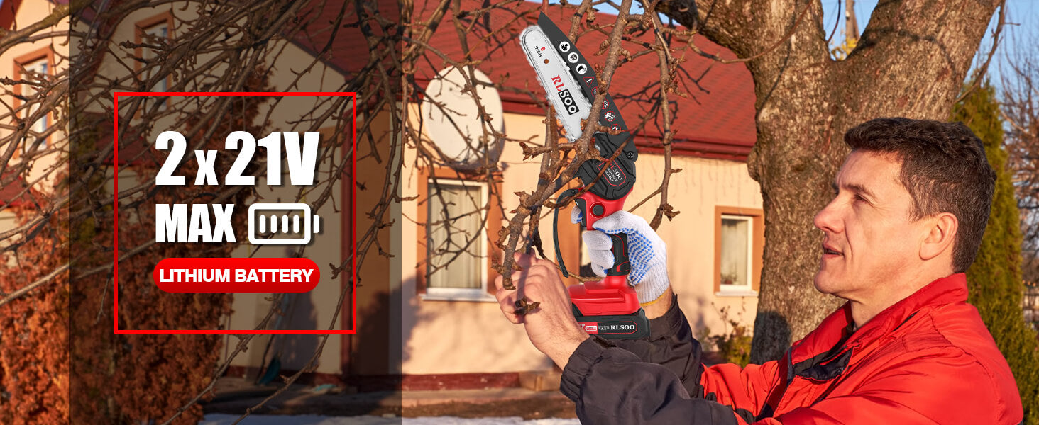 RECHARGEABLE ELECTRIC CHAINSAW: Equipped with 2pcs 21V removable and rechargeable 3000mAh Lithium batteries, the RLSOO mini electric chainsaw offers long-lasting use. It charges quickly and can be used at any time. For prolonged storage, fully charge the batteries.