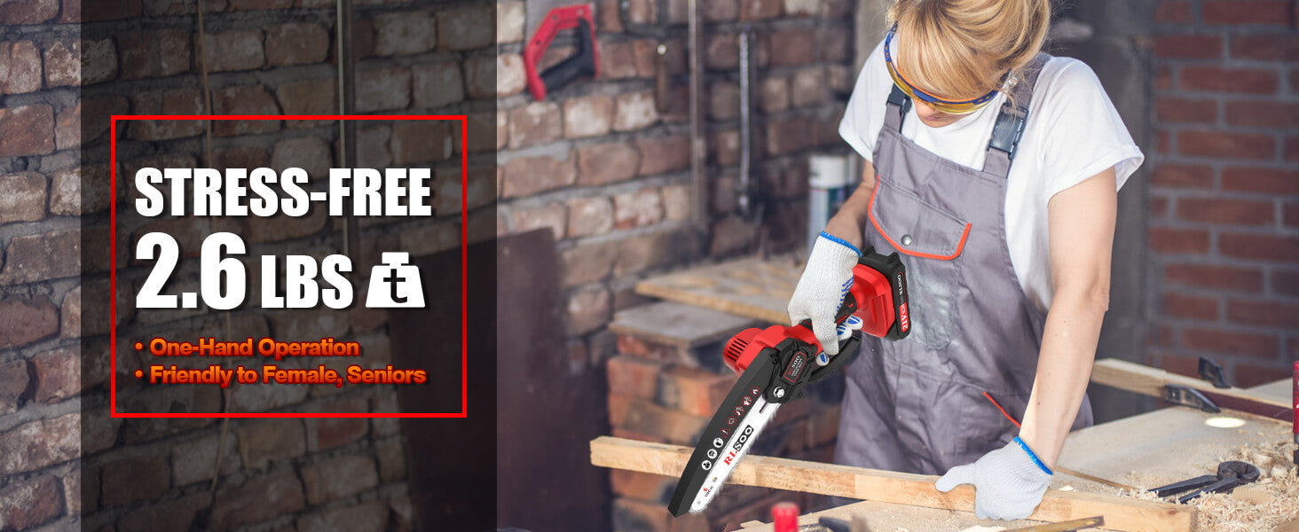 PORTABLE & ONE-HANDED OPERATION: Weighing approximately 2.6lbs (including the battery), this handheld mini chainsaw is lightweight and portable. Easy to assemble and suitable for indoor and outdoor work, it can be easily controlled by women and the elderly, making gardening tasks simpler. Consider gifting it to parents and grandparents.