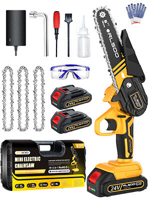 Included Components | 2 X BATTERIES; 3 X SAW CHAINS (1 HAS BEEN INSTALLED), 1 X MINI CHAINSAW 6 INCH (ASSEMBLED), 1 X CHARGER, 1 X SCREWDRIVER; 1 X WRENCH; 1 X BRUSH, 1 X GLOVES; 1 X GOGGLES; 1 X OIL BOTTLE(EMPTY); 1 X USER MANUAL; 1 X STORAGE BOX |